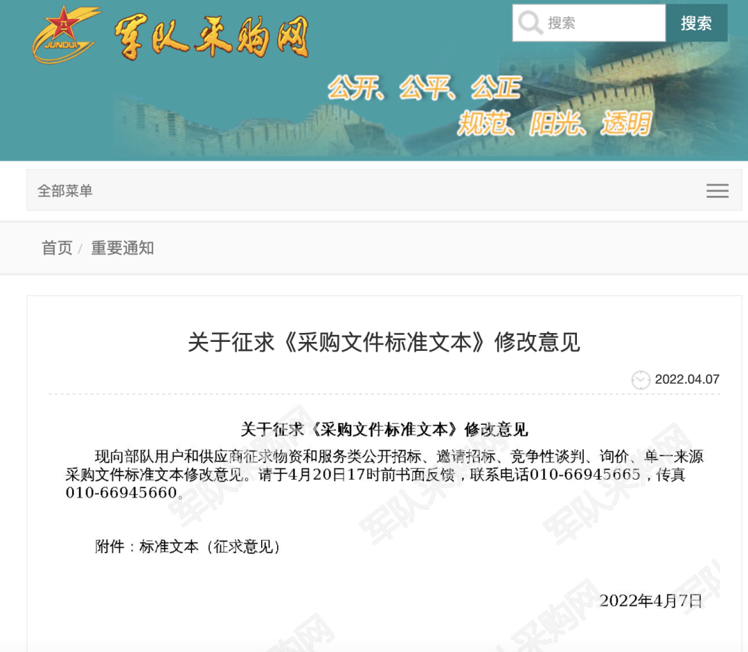 同月,军队采购网发布《关于征求〈采购文件标准文本〉修改意见》的通知,该标准文件内容包括物资和服务类公开招标、邀请招标、竞争性谈判、询价、单一来源采购文件等标准文本。