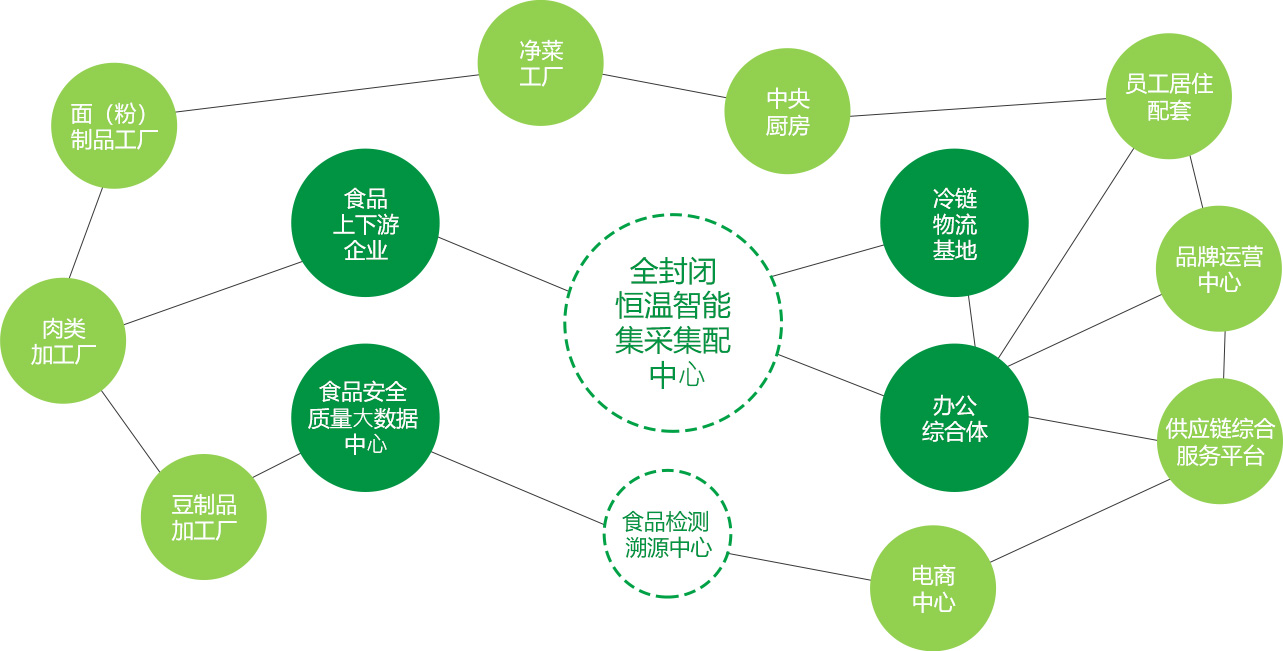 食品科技产业园定位为建立一个由政府、消费端、企业三方监管的从农田到餐桌的食安保障基地,服务当地学校、机关事业单位、部队、企业等单位以及居民菜篮子,彻底解决食品安全问题;并以食材配送带动当地一产、二产、三产融合。